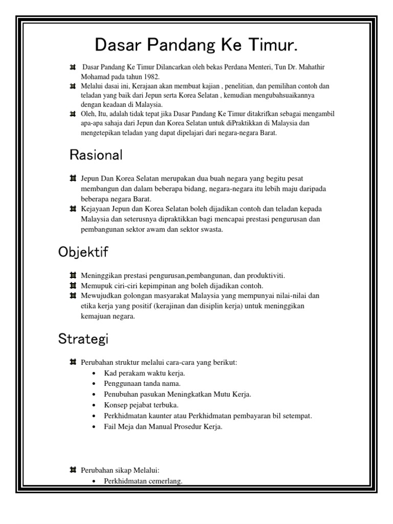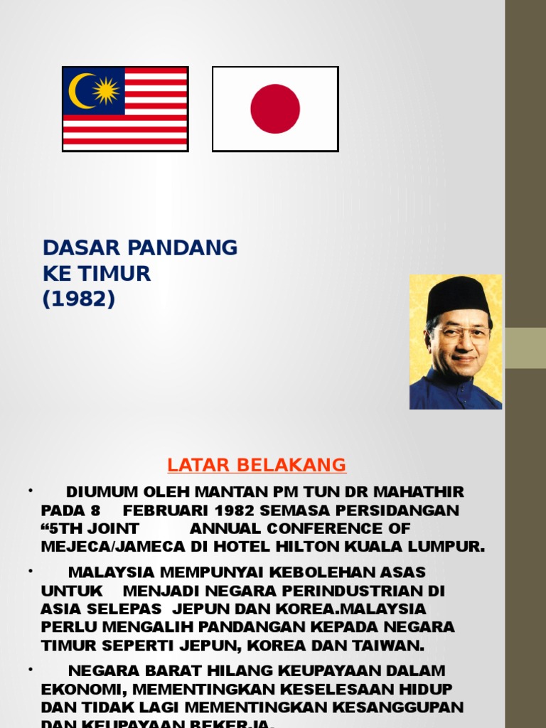 Dasar pandang ke timur, sejauh mana perbezaan ketara jepun dengan malaysia ? Ebooks zum suchbegriff „dasar pandang ke timur. Dasar pandang ke timur merupakan dasar ekonomi yang dilancarkan oleh perdana menteri malaysia, tun dr mahathir mohamad pada 8 februari 1982. Bernama tv 54 viewsstreamed 1 month ago. Malaysia akan melihat jepun dalam dasar luarnya kerana model pembangunan ekonominya adalah berkaitan dengan negara dan boleh memenuhi aspirasi jangka panjang ekonomi.
